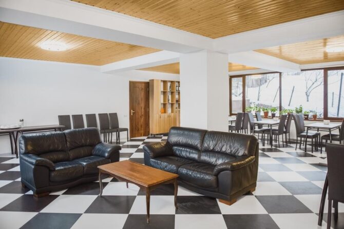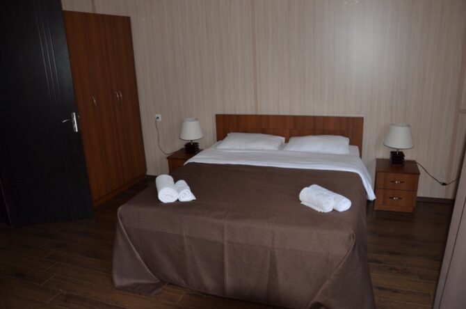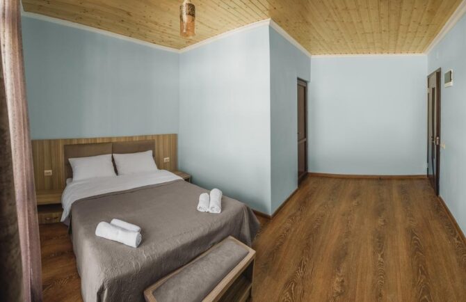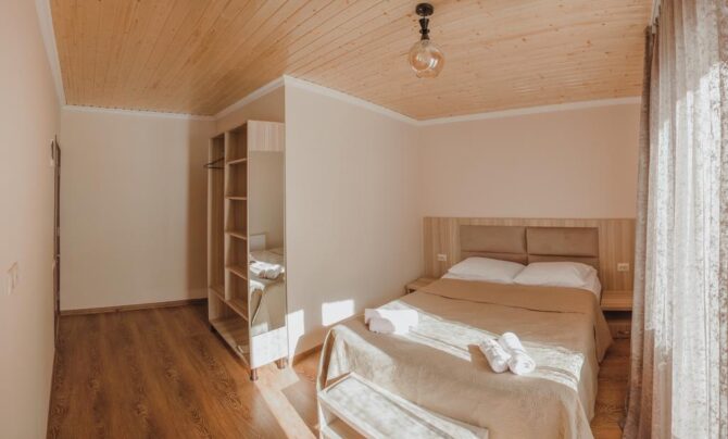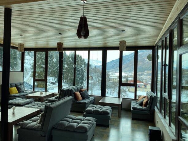 Guest cottage is not in vain called an elite house. Here everything is thought out for the convenience of location and a relaxing holiday of guests. Rooms – double and family. All are decorated in a classic restrained style without frills and decorative elements. In contrast, the interior of the stairs, lounge area, living room, terrace is quite interesting and elegant. At the reception you can book a sightseeing tour, get information about the nearest hiking routes. Hatsvali-Zuruldi Ski Ressort is 400 metres away. The owners offer half board, which includes breakfast and dinner. The restaurants of Leila and San Set are nearby, and there is a market a few meters from the entrance. Many hotels in Mestia offer full boards. When booking, you need to clarify the information with their owners.