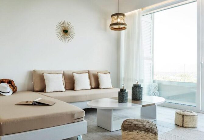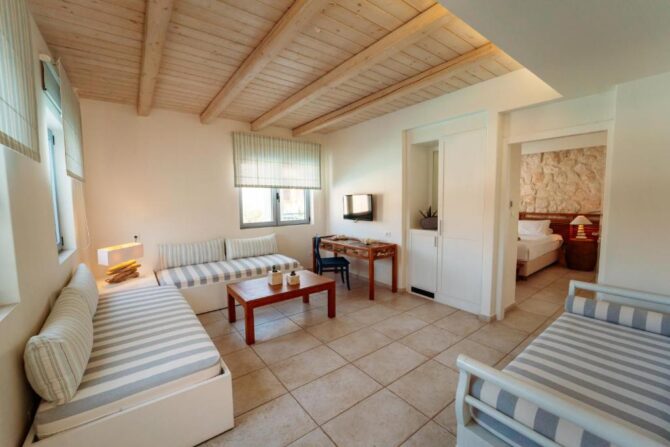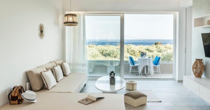 14 km from Ierapetra on the road leading to the city of Sitia, on a rocky slope are located apartments of the four-star hotel Pignolia Suites. The hotel opened its doors in an updated form in March 2020 From Pignolia to the nearest pebble beach – 650 meters. The hotel enjoys a quiet location surrounded by tall pine trees, close to the village of Agia Fortia