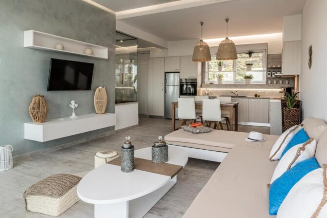 There are always a lot of tourists who dream of preserving the usual home environment during their holidays. For them, one of the most suitable options will be accommodation in Kallia Luxury – a comfortable private house. Friendly owners rent it to tourists in the summer season. The holiday home is equipped with everything you need for a comfortable stay and rest: