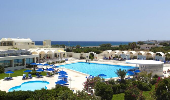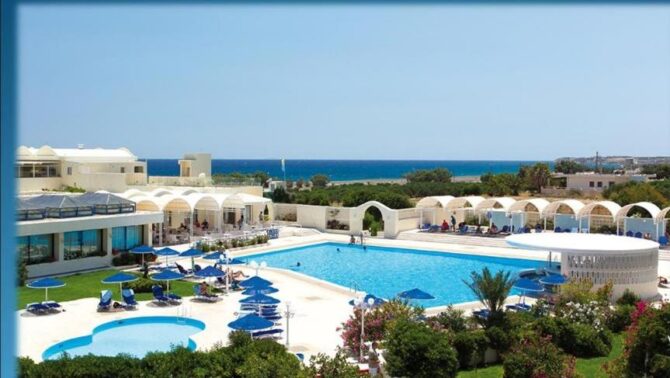 9 km east of Ierapetra surrounded by subtropical greenery are two- and three-storey buildings of the hotel complex Sunshine Crete Beach. The five-star hotel opened its doors in 1989 The last reconstruction was carried out in March 2015 “Sunny Cretan Beach” – so you can translate the name of the hotel – is located on the sea coast next to the village of Kutsounari.