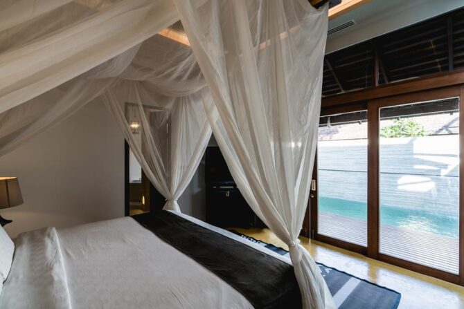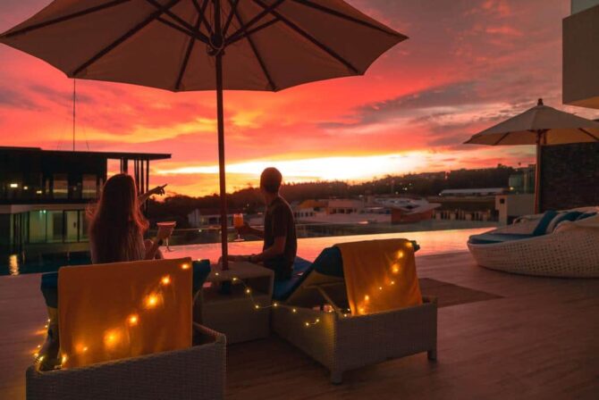 During the day, guests relax in the chic lounge area, which includes several infinity pools. You can sunbathe on the beautiful terrace surrounded by tropical trees.