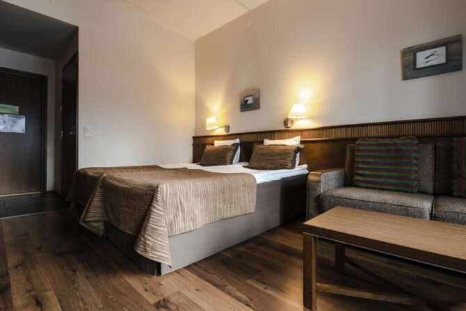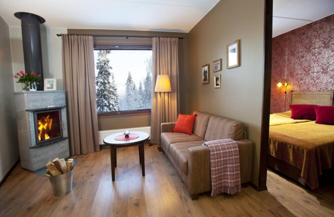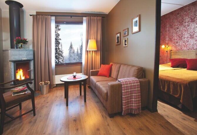 Lapland hotels are compactly located in the area of the ski resort around the slopes. Lapland Hotels Luostotunturi & Amethyst Spa is popular with travelers due to its original architecture and unusual landscape with dried pine trees. It looks like an oasis in the middle of the desert. The complex offers 176 accommodation options, including log cabins. It offers three restaurants, two of which are à la carte. The largest 670 seats serve breakfast. On weekends, there is a nightclub, entertainment programs, guest artists perform.
