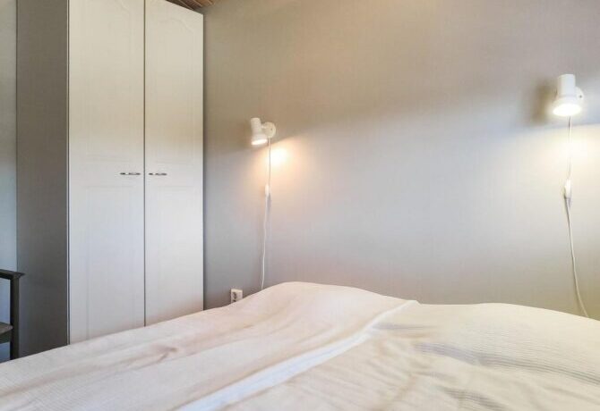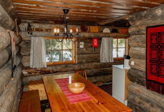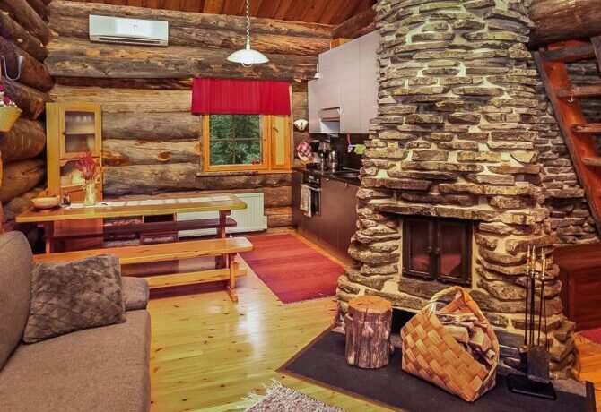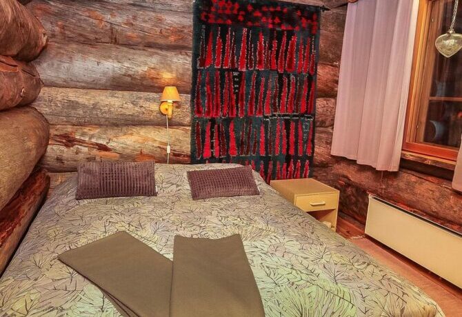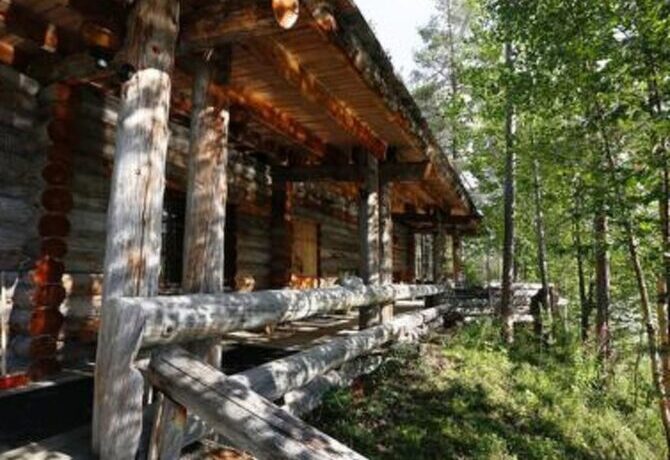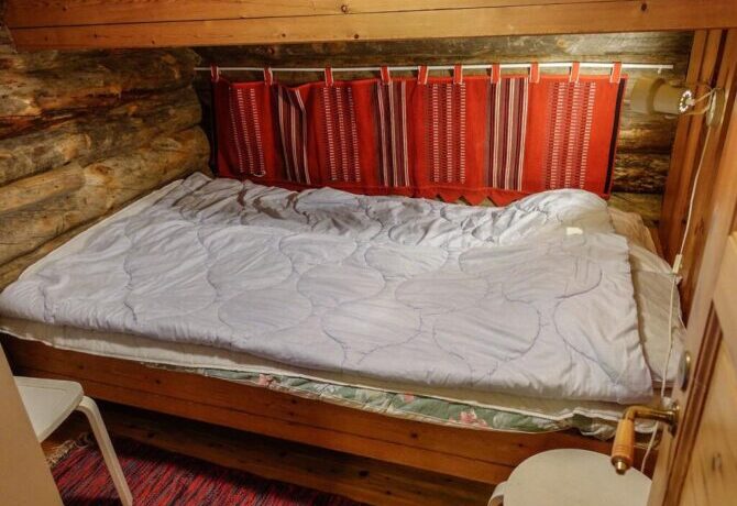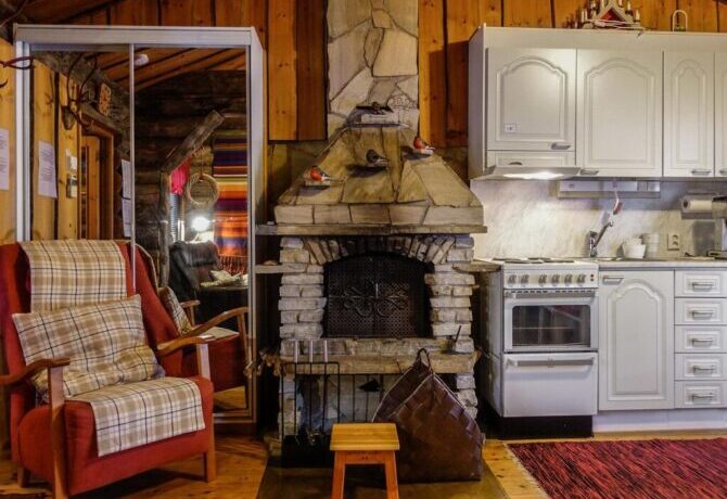 The farther into the forest, the more interesting the houses. This wooden holiday cottage is located just two and a half kilometers from the Amethyst Mine. It has preserved an old stove, and the entire interior is made in Finnish folk traditions. Here, stone is combined with wood, and bright homespun textiles with snow-white modern blankets. The house is well located in relation to the walking trails and paved ski slopes.