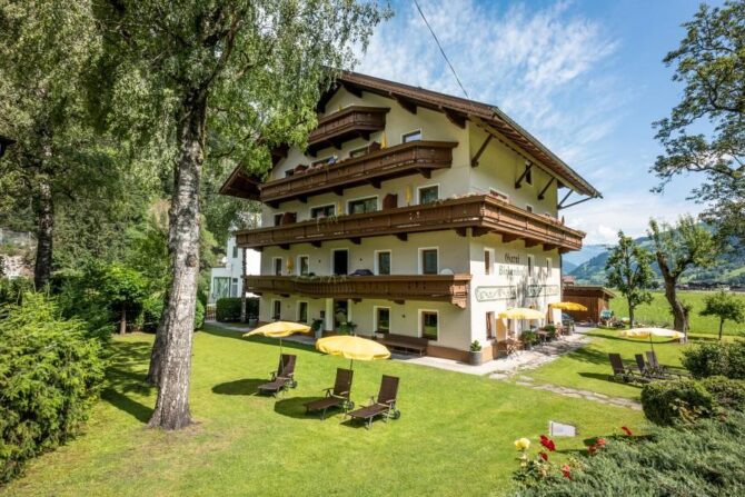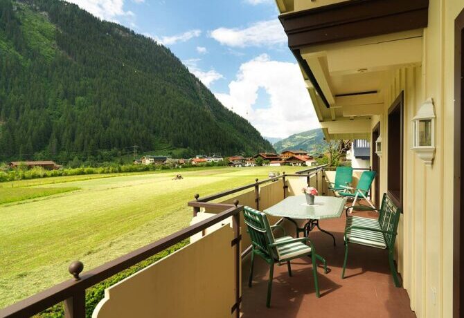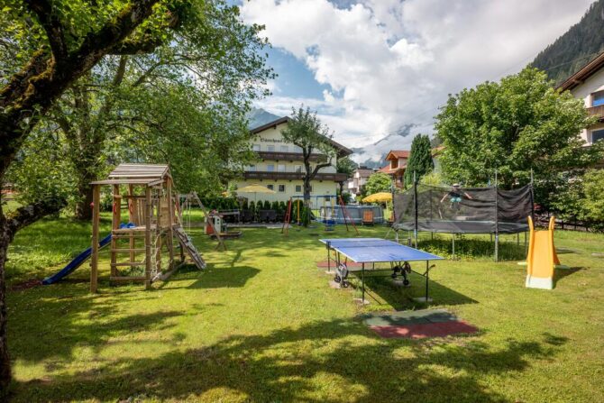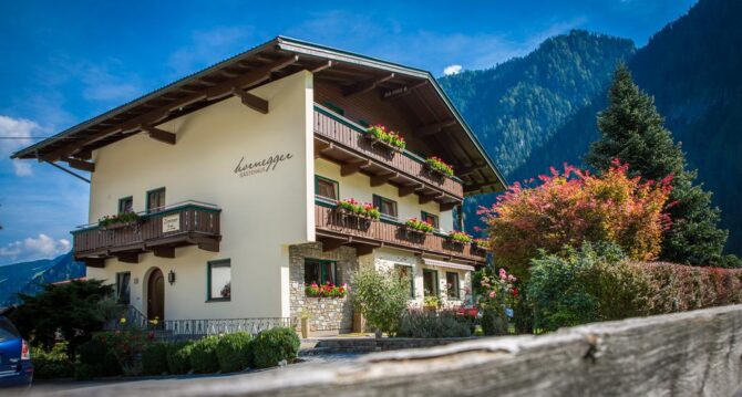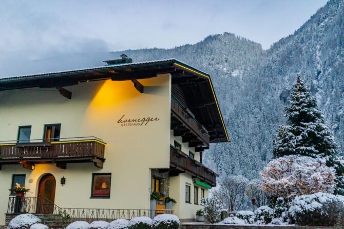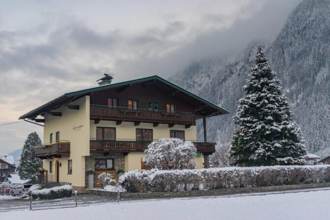 A 2-minute walk from the centre in a quieter area is a traditional Alpine village guest house. Guests are settled in two, three local and family rooms. Parking is free and there is a children’s playground in the garden. The house has a common living room, a storage room for ski uniforms, a terrace. In the morning, the hostess serves breakfast, the rest of the time guests take care of the food themselves. Nearby there is a restaurant-bar “nächstgelegenes”. A ski bus stops 80 metres from the house every 15 minutes. The cable car is 900 meters away, the Mayrhofner Bergbahnen lift is 500 m away, so it is better to use transport. The owners accept pets.
