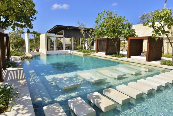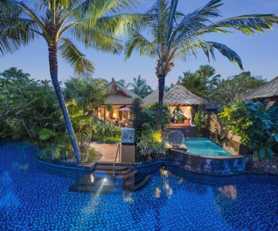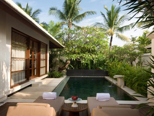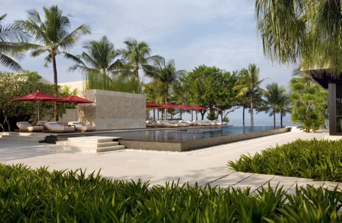 The Bale is one of the most luxurious properties in Nusa Dua. Relaxing décor and gorgeous grounds amaze at first sight. Housed in private pavilions surrounded by their own fenced gardens, the hotel’s 29 rooms offer a level of privacy that is hard to find in other luxury resorts. All rooms have lovely infinity pools and first-class bathrooms with outdoor showers. The spa offers signature treatments in minimalist rooms, as well as a beautiful bunk infinity pool.