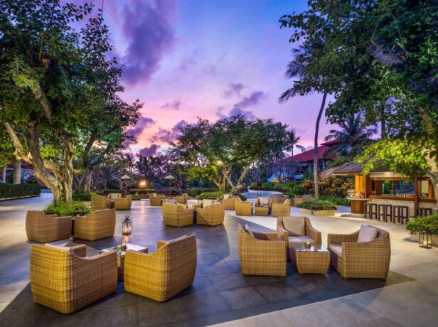 The upscale Melia Bali Hotel has 494 rooms set beautiful grounds with palm trees, bougainvilleas and many lake fountains. All rooms have a patio or terrace, air conditioning, tea and coffee making facilities, a minibar, a safe and a marble bathroom. The hotel’s several restaurants serve dishes from all over the world, as well as a huge lagoon-shaped pool and extensive venues for events for meetings and weddings.