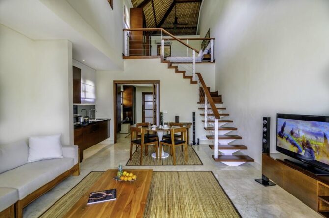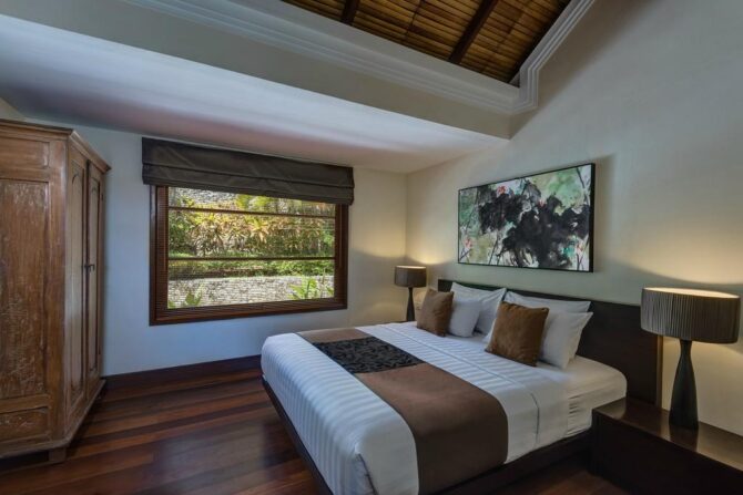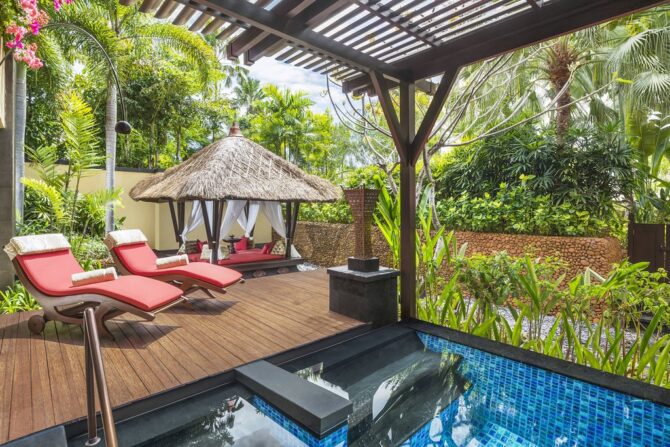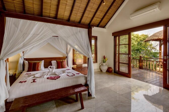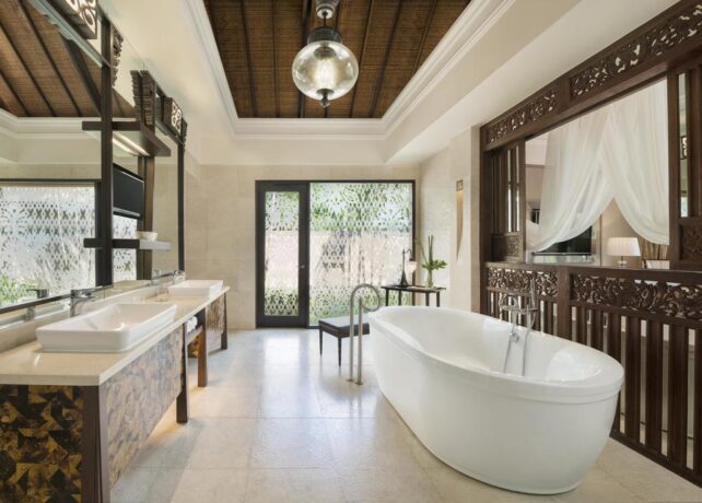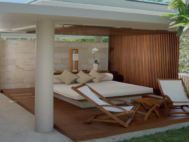 Kayumanis Nusa Dua’sadults-only villas offer an intimate and serene atmosphere in just 20 villas. Each villa is housed in its own traditional Indonesian pavilion with a thatched roof and beautiful dark wood floors. Tastefully decorated villas, local flavor in the interior, with four-poster beds equipped with mosquito nets, traditional furniture with beautiful carvings and accents of natural fibers in carpets and decorations.