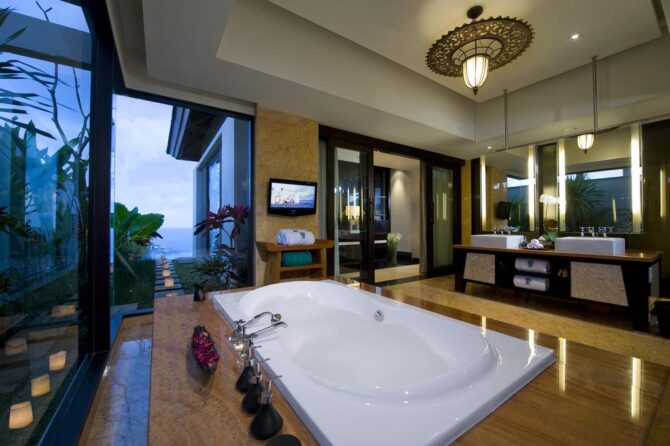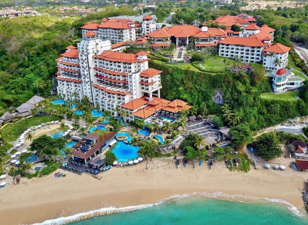 The luxurious beach resort is located on top of a cliff five minutes from downtown Nusa Dua. The number of rooms includes 81 suites and villas. The rooms are elegant and stylish, the design combines modern and traditional Indonesian motifs. Each room is equipped with amenities and a balcony with magnificent ocean views. The villas have their own infinity pools and up to two bedrooms.