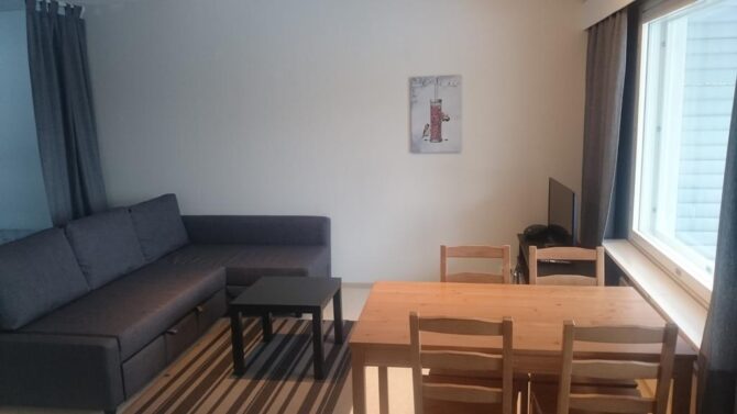 (At the end of March, a huge amount of snow fell, which this year ([y]) did not even exist in Central Finland. Next to the hotel there are well-groomed ski slopes. It is a peaceful place, although the ski resort of Paljakka is nearby. The apartment is spacious and suitable for people with disabilities or, for example, for a joint holiday of more than one generation. A little boring, but functional furniture and fittings Ikea. Two separate bedrooms, nice beds for four + living sofa bed for two, if necessary, you can find a cot. Spacious kitchen and table for 6 people) Lina, Finland