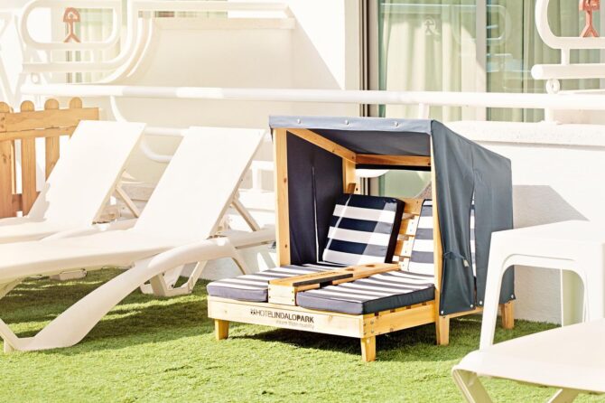 Aquamarina Santa Susanna’s buildings are built around a beautiful infinity pool. The complex is located a hundred meters from the city beach, equipped with a cabana for changing clothes, sun loungers and umbrellas. The windows of the buildings overlook the beach and the pool, and the balconies furnished with rattan furniture also look at it. The rooms are decorated in a minimalist style, much attention is paid to space and freedom. And the circulation of fresh air in each room provides air conditioning.