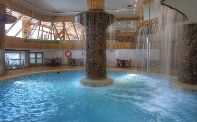 It features seasonal indoor and outdoor pools and a sun terrace with sun loungers. Guests can rent a car for sightseeing tours or boutiques.