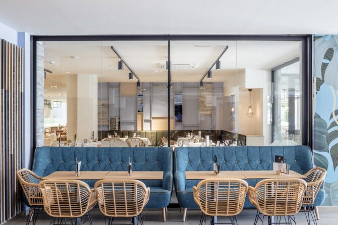 The restaurant serves a buffet breakfast and an à la carte lunch and dinner. The cuisine is mostly Mediterranean, with an abundance of seafood and fish. The products are local, very fresh. In addition to the main restaurant, guests can visit the three bars operating on site. And if that’s not enough, the centre of Santa Susana with its many shops, cafés, bars and restaurants is a short walk away.