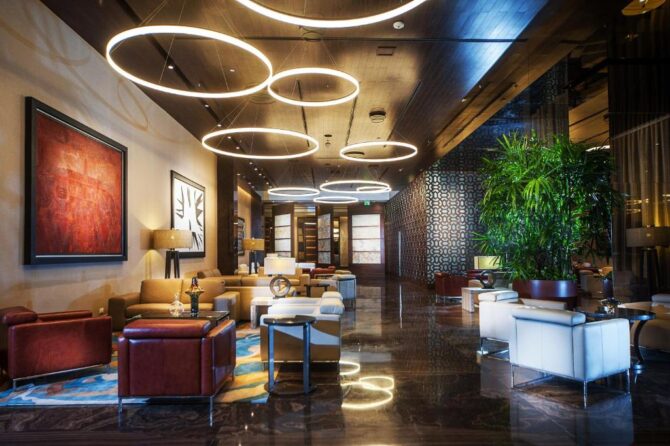 The hotel has several lounge bars (especially Vertygo 101, which serves signature cocktails) and the international restaurant Winston’s Grill & Pati (even cheeseburgers are served here).