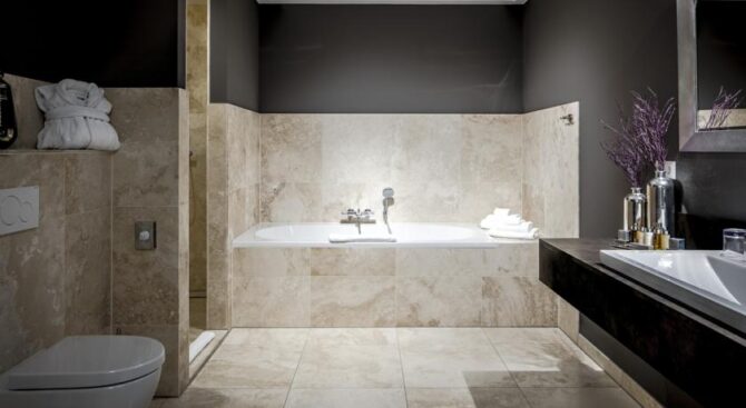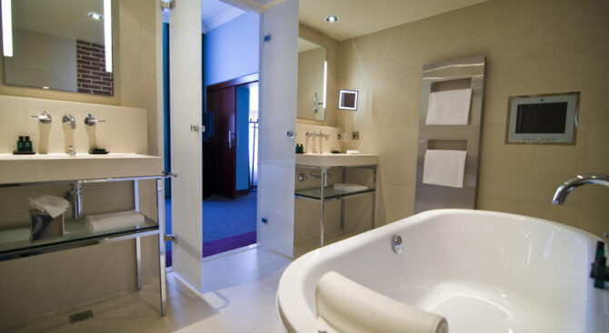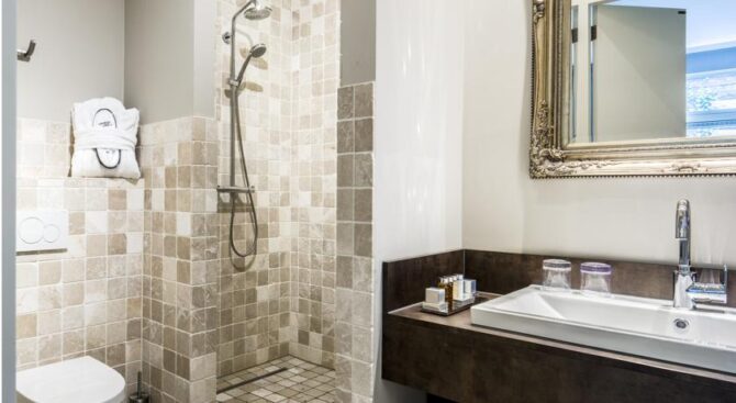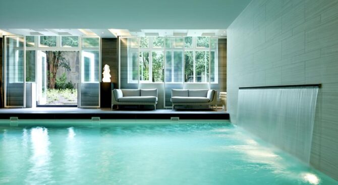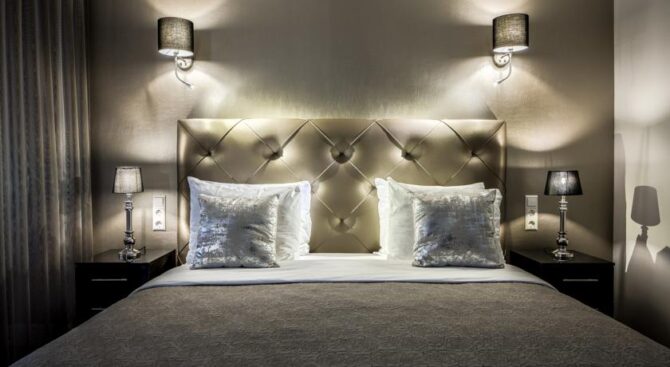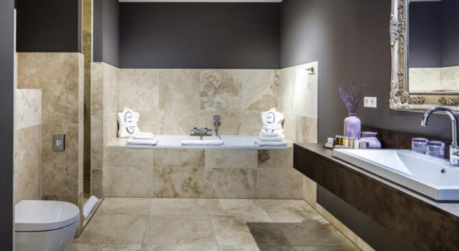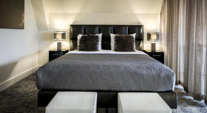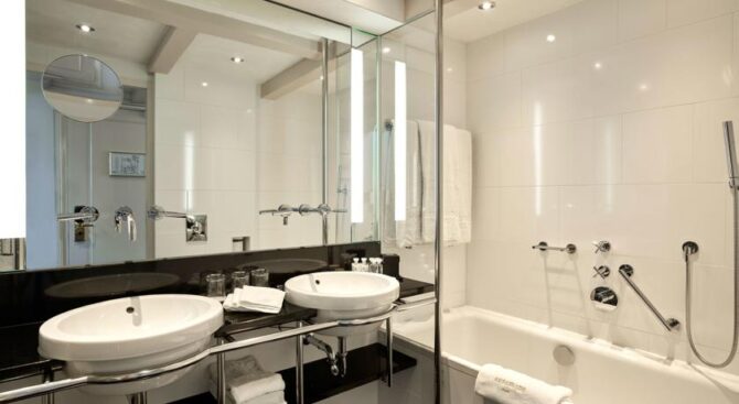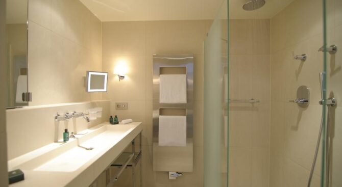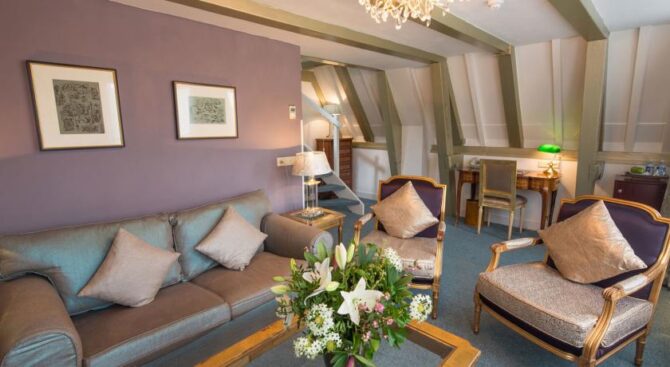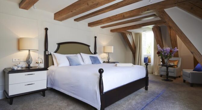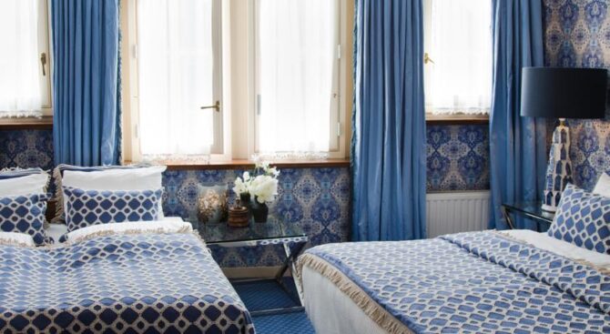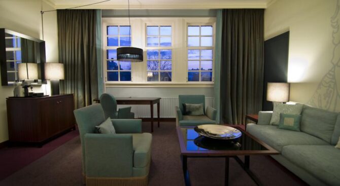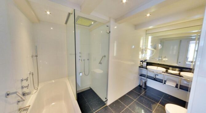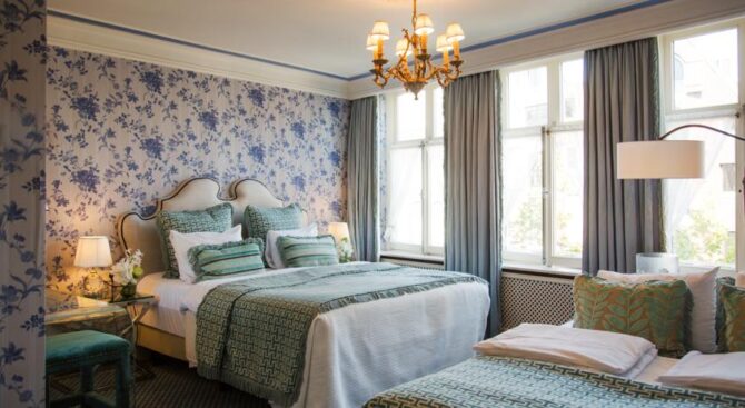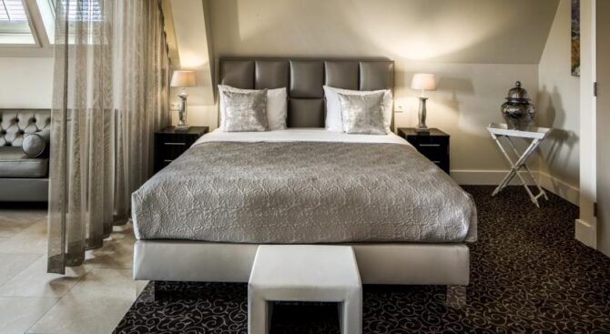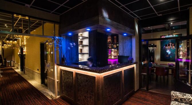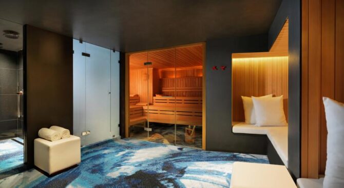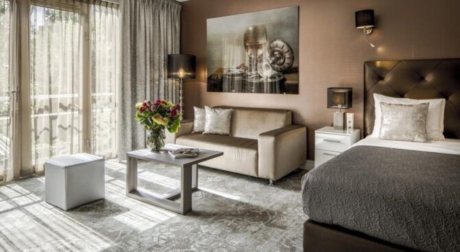 This hotel is unique in its kind. It consists of six buildings in the style of the XVII century, this is a real palace complex for tourists. On the territory of the complex there are two restaurants – a two-Michelin-starred restaurant of European cuisine, and a beer restaurant. There is also a cosy bar. Right on the territory of this facility there is a huge sports center, a SPA with massage rooms, a hot tub, a sauna and a large indoor pool.