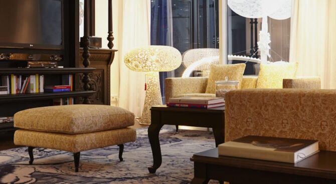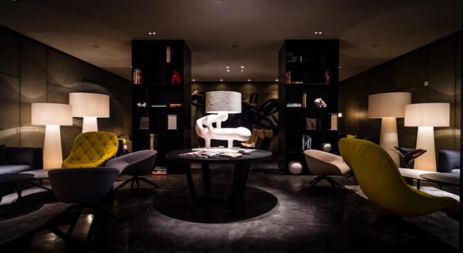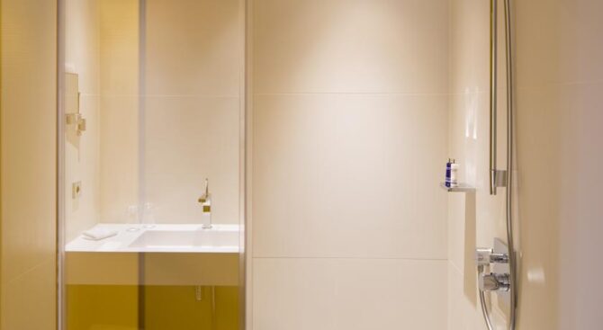 A special feature of this hotel is the design of each room. All of them are made in different ways, marcel Wenderson was engaged in the development of the interior. Each room has a spacious bathroom and bath amenities. There is also a seating area with a TV and a minibar with free drinks.
