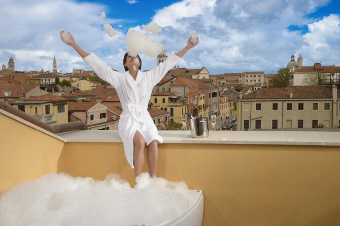 There is an open-air bar offering a glass of wine or champagne overlooking the Venetian rooftops.