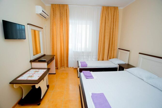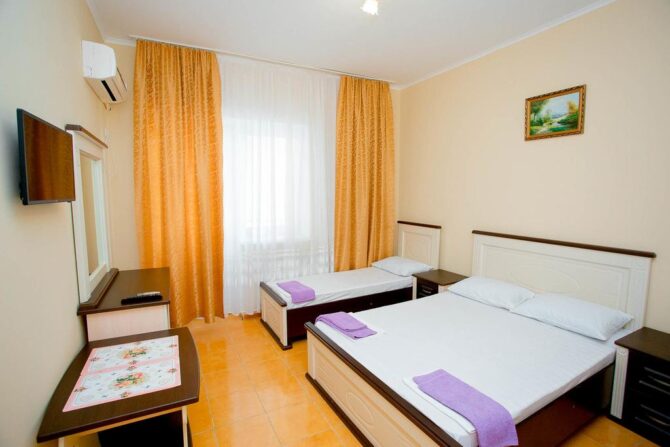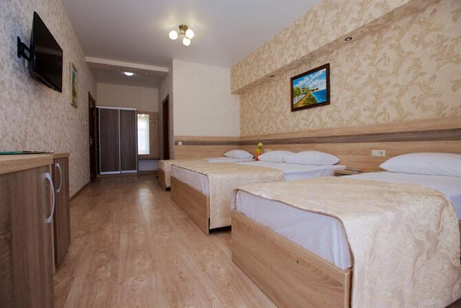 Отель Коралл | 7,3 км до аэропорта Витязево | Стандарт Трехместный номер Люкс | Сейф Телевизор Кондиционер Фен Утюг Холодильник Звукоизоляция Микроволновка | Бассейн Детский бассейн Дайвинг Пешие экскурсии Аквапарк | Цена номера за ночь – минимум 30 EUR. Дети до 2 лет – бесплатно. | Нет. |