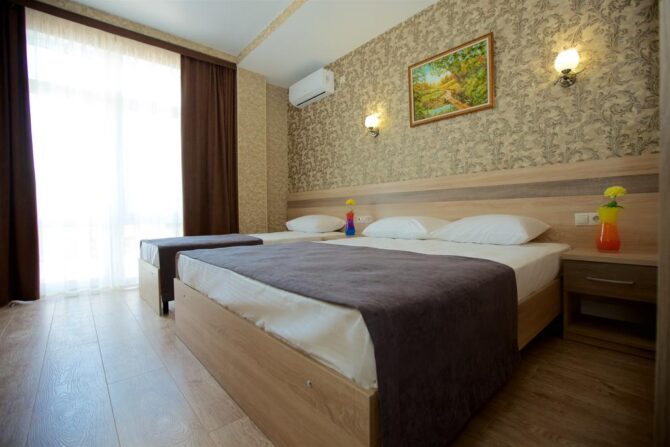 Отель Артика | 6,4 км до аэропорта Витязево | Полулюкс Семейный люкс Трехместный номер Четырехместный номер | Сейф Телевизор Кондиционер Фен Утюг Холодильник Звукоизоляция | Бассейн Игрушки у бассейна Игровая площадка Аниматоры Вечерняя программа | Цена номера за ночь – минимум 60 EUR. | Нет. |