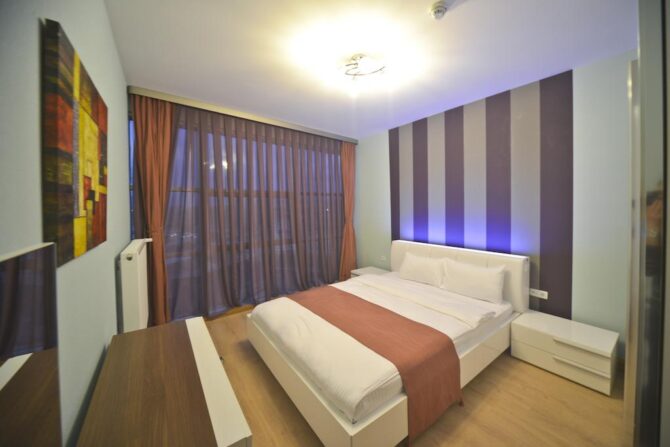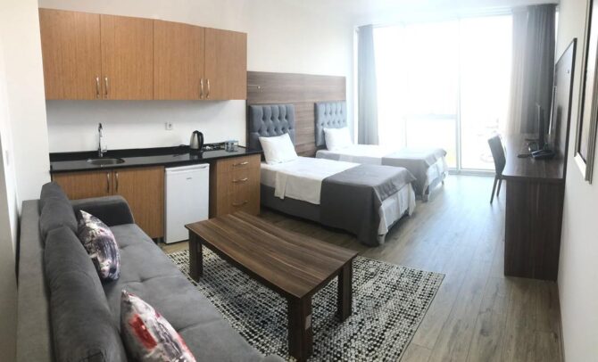 Clean and spacious. Convenient location for local shops and various catering establishments and a 5-minute taxi ride from the airport. Large room with king-size double bed, kitchenette with oven. Clean bed linen, towels. Large bathroom. Two cafes in one building, one with traditional Turkish cuisine, the other with a pastry shop. Supermarket across the street.