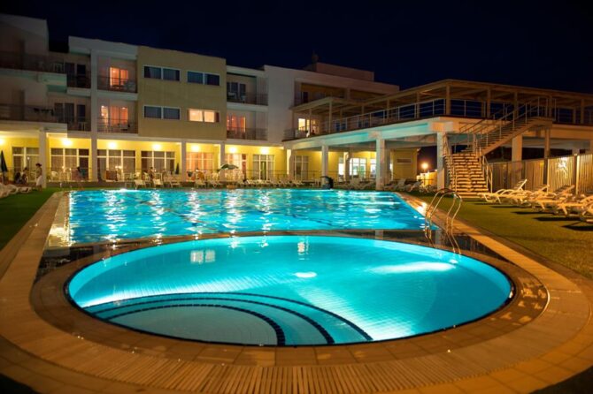 The All Inclusive also includes a private beach 50 meters away, equipped with canopies, sun loungers and changing rooms. The beach is sandy and pebbly, the depth is smoothly passing. If you do not want to swim in sea water, you can visit the outdoor pool on the territory of the complex, with fresh water, heated. Access to the pool is available until 21:00.