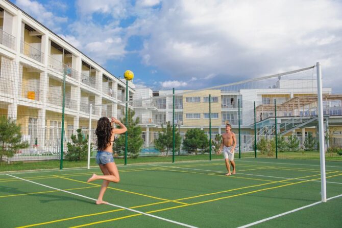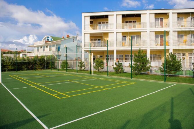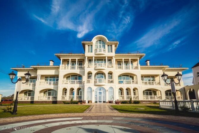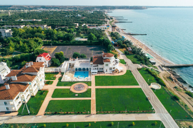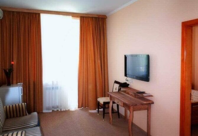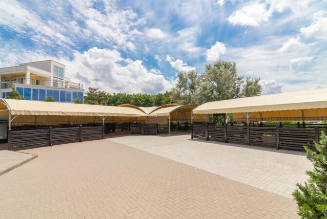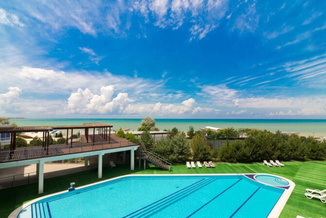 The complex offers vacationers to enjoy the benefits of the steppe and sea climate. On the protected territory of the hotel with an area of 4.5 hectares there is a luxurious park and a rose garden, well-groomed paths, playgrounds and alleys. The hotel has two residential buildings in the 3rd and 4th floors. Each of the 102 rooms has a private bathroom with a shower and appliances. It offers vacationers a swimming pool with fresh water with an area of 220 square meters, heated and children’s compartment. Around there is a seating area with sun loungers and parasols. For active recreation there is a football field and a volleyball court, a games room with an animator and an outdoor children’s playground.