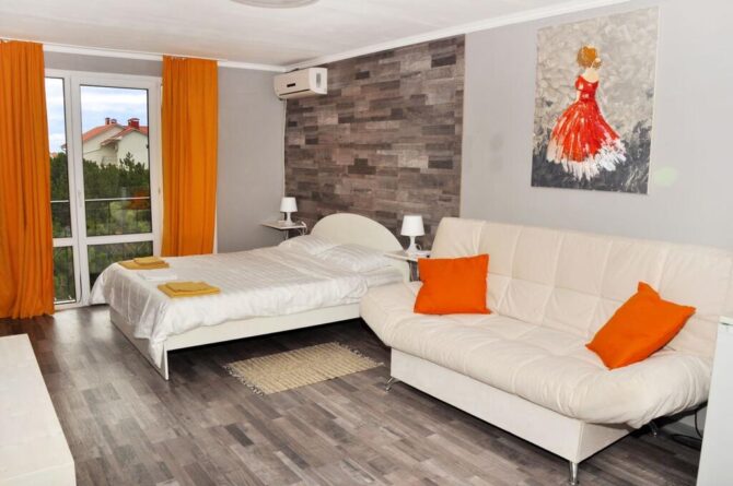 In the hotel “View Apartments”,in a house by the pool, you can rent the entire floor at once. It has a kitchen-living room, a bedroom and a bathroom. As well as a panoramic window with a French balcony and sea views. In the interior, every detail is thought out to the smallest detail, there is everything for a full life and for a relaxing holiday.