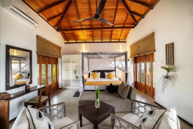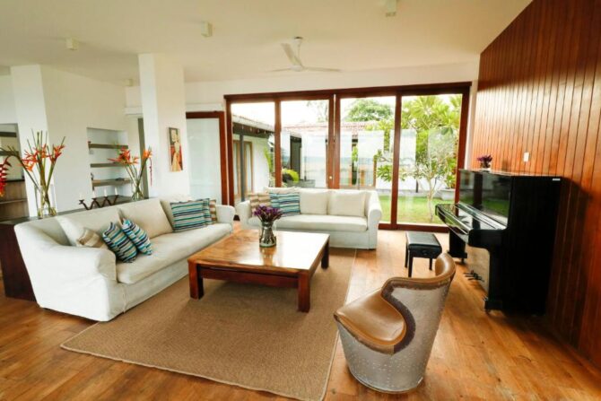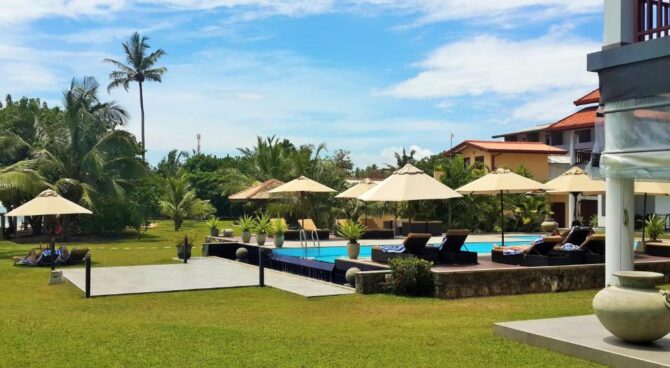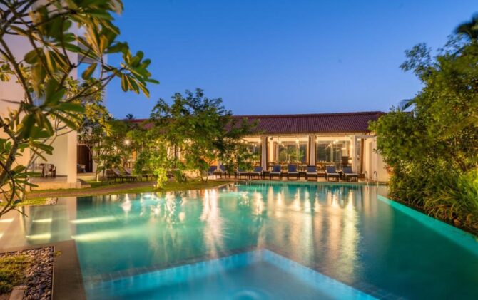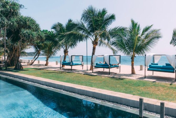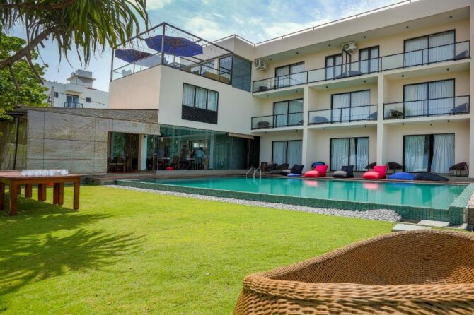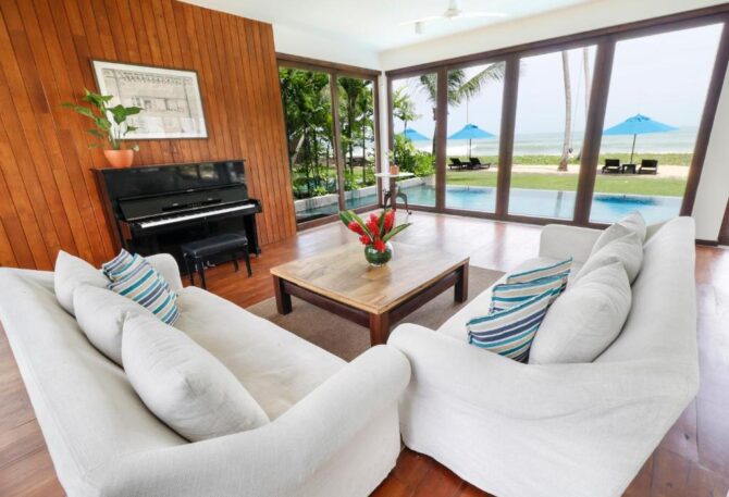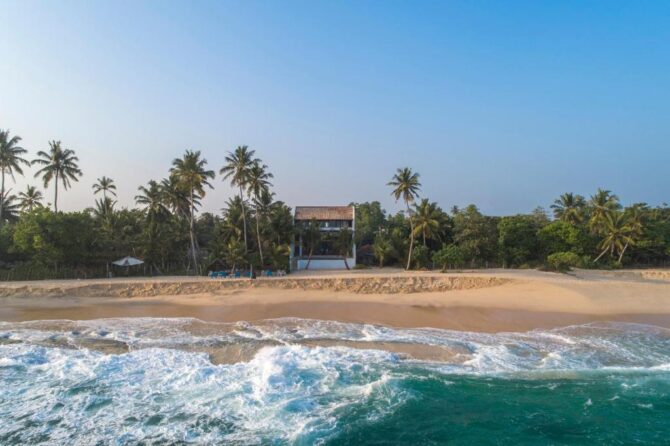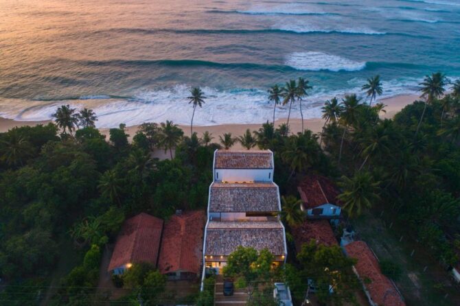 This 5-star villa is somewhat identical to the previous hotel. It is part of the gold collection of boutique hotels in Mirissa. It is characterized by a perfect combination of indoor living space and open-plan design overlooking the Indian Ocean. The hotel consists of 4 Deluxe Suites and 2 Suites. All rooms have large balconies with a private seating area overlooking the Indian Ocean. There is a modern bistro with an open kitchen on site. Food is prepared in front of visitors. There is also a bar counter, so drinks do not have to wait long. Tables on the terrace are installed next to the pool. Some guests like to combine a pleasant pastime in the pool with a drink or a snack. Another category of guests usually rushes to the beach. Here they are engaged in water sports – surfing, diving, swimming. Another part of the guests devotes their free time to excursions. From the hotel it is convenient to go to the turtle nursery, the elephant sanctuary, the old fort in Halle, tea plantations, the National Nature Park to watch flamingos.