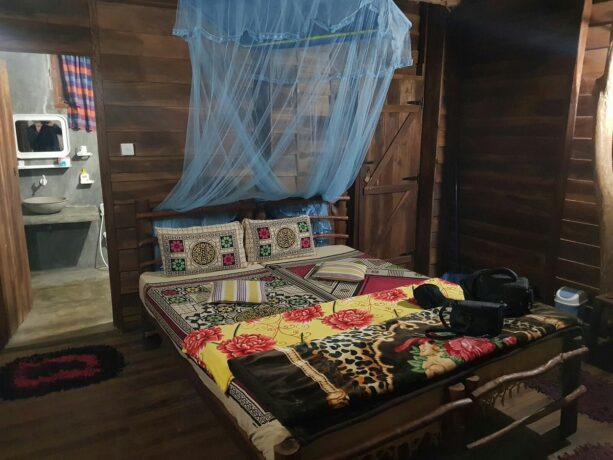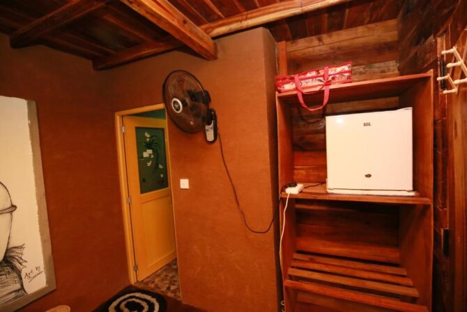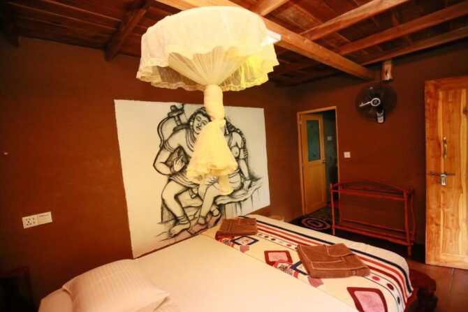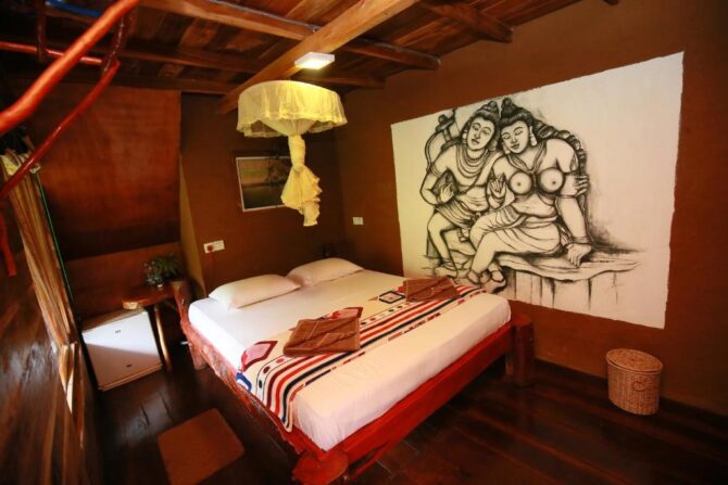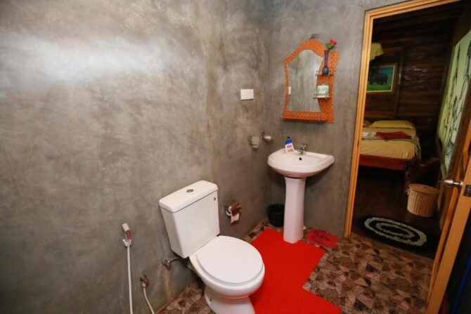 Not far from the Monastery in Ritigal there is a cozy and authentic guest house in the forest. The property offers a double room with a private entrance and air conditioning. The rooms are located on the lower and upper floors (there is a staircase for climbing). The owner of the guest house decided to make the rooms so that the trunks of trees pass through the floor, which is unusual and interesting at the same time. The bathroom with all accessories and shower is separated by a grid from the bedroom. In an urban environment, this would seem unacceptable, but for a tree house it looks very organic. The terrace overlooks the garden and is covered by a mosquito net. The room has a bed, a small living room with a mini-bar, air conditioning (power is designed for one room) and a tea corner.