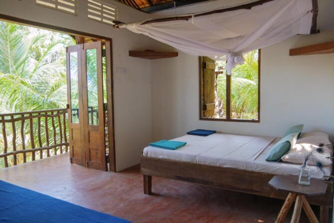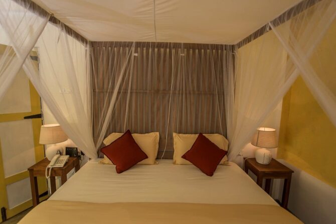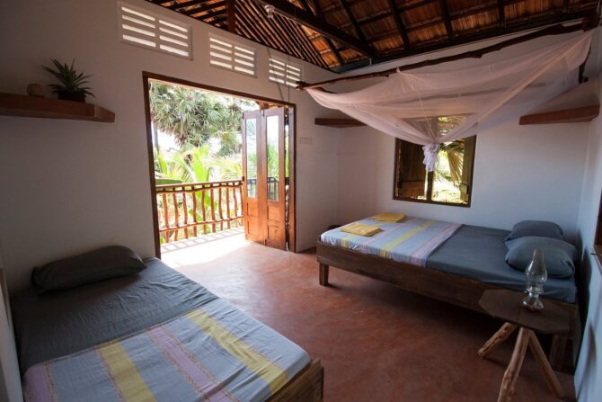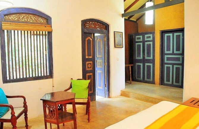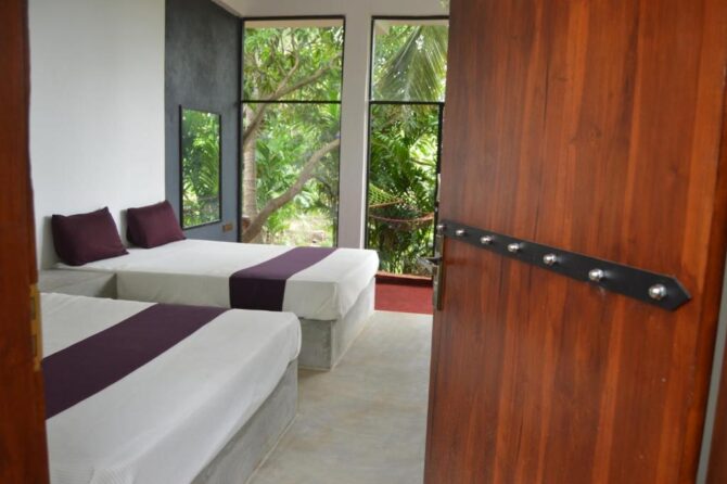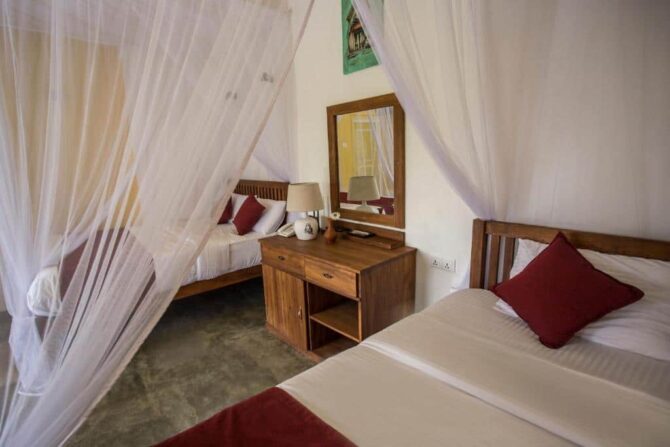 The rooms are simple but homelike: they have a bedroom with extra long beds and a balcony, a seating area with a patio and a private bathroom. In Sri Lanka, it is customary to put even a bidet, which indicates an attentive attitude to guests who come from a completely different climate. The hotel offers an Asian menu, but guests also cook themselves in the equipped kitchen. Weather permitting, guests can sit out in the garden for lunch or dinner.