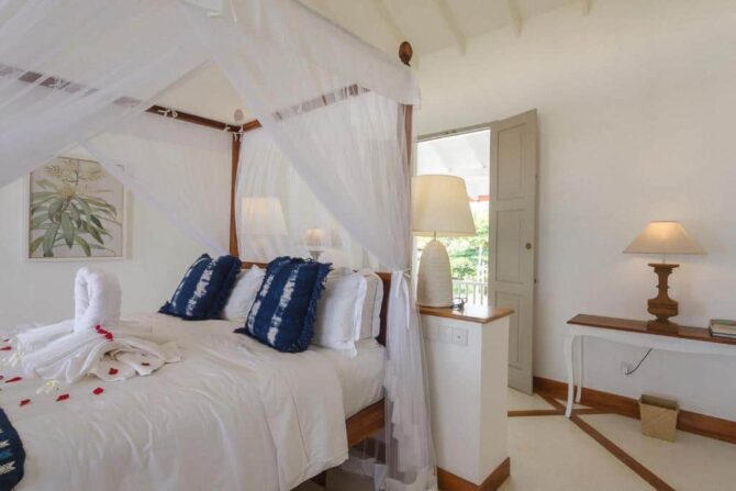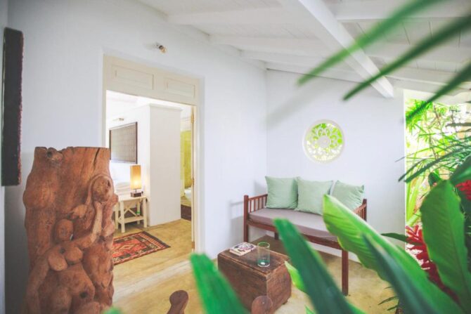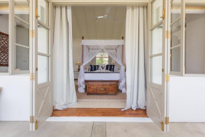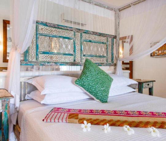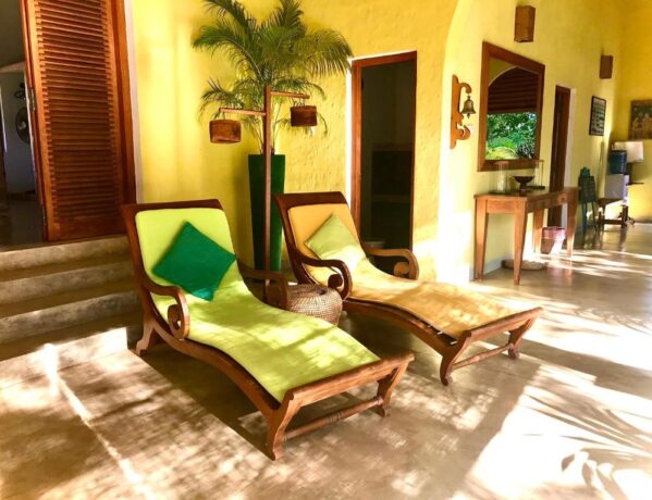 For self-catering there is a well-equipped kitchen. In front of the house there is a chic garden with installed sunbeds. Here you can relax in the shade of sprawling trees and admire the stunning views of the Indian Ocean. Breakfast is included in the room rate and served directly on the villa’s outdoor terrace. Evening meals can be prepared upon prior reservation.