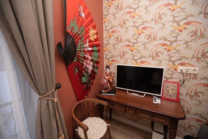 - The Chinese Suite (22 sq. m.) resembles a shop of Chinese toys. On the wall – a large fan, on the bedside tables – porcelain dolls, above the bed – paintings made in the Chinese painting technique. The yellow-red color scheme prevails. But in general, a muted calm atmosphere is created due to the use of shades of brown. The area allows you to install another bed.
