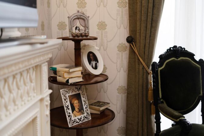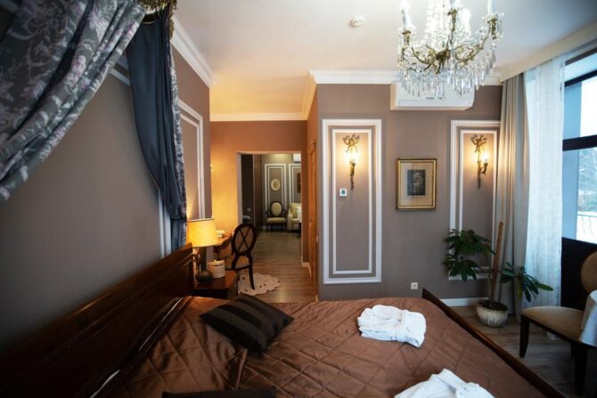 - French Suite (45 sq. m.) is designed to accommodate 3 people. It consists of two rooms with a balcony. For a woman, there is even a kind of boudoir with a small cosmetic table and a mirror. Chic interior consists of plaster decorative moldings, furniture “antique”, beds with canopies. A baby cot is already installed in the room and is also covered with a canopy.