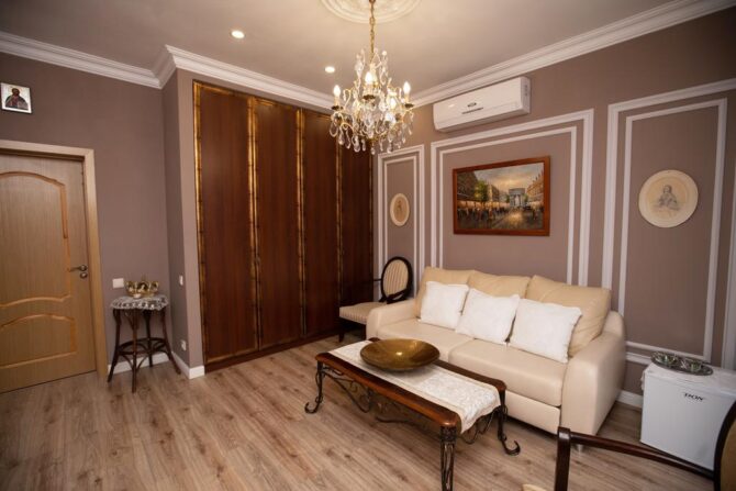 The boutique hotel is located in a two-storey building. Its luxurious interiors immediately conquer guests as soon as they enter the hall. There is a reception here. For visitors there are soft sofas with pillows and blankets, armchairs, treats and chess on the coffee table. In the common living room there is a real home buffet. It has jam, biscuits, pastries. The caring staff will brew a cup of coffee or brew tea at any time of the day. The service includes wake-up service, taxi call, ordering food and drinks in the room.