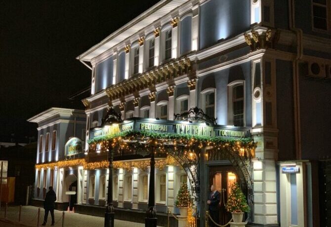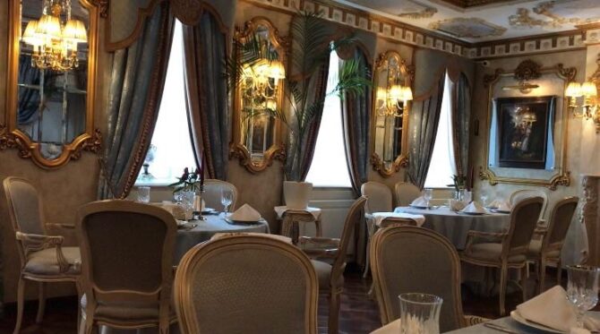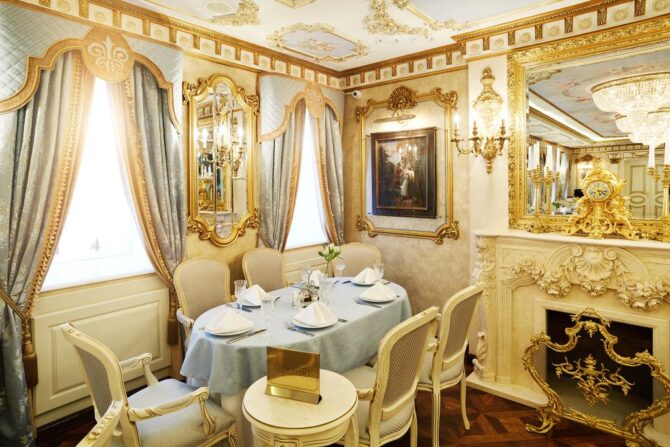 Restaurant “Turgenev” deserves a separate description, starting with the interior and ending with the menu. Its dining room is decorated with marble floors, on the ceilings – painting and stucco, on the walls – paintings by European painters. There is also a collection of antique watches made of bronze. This place is considered the best for appointed romantic dates.