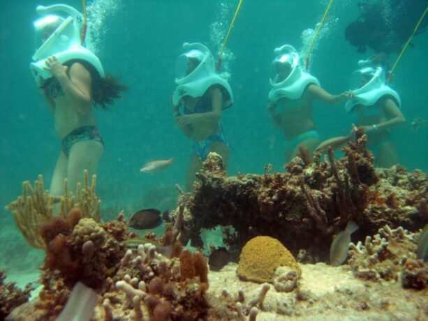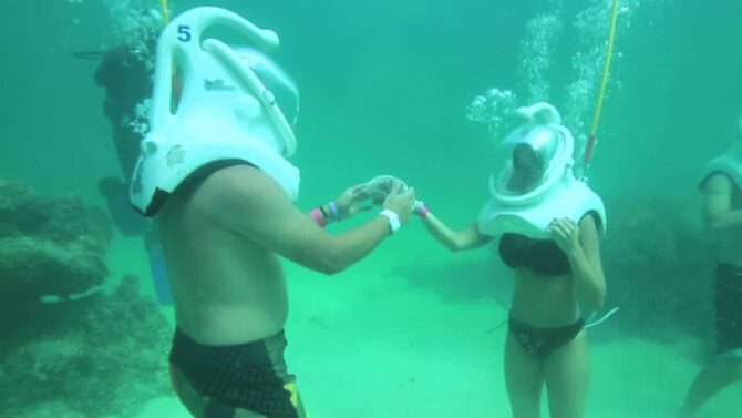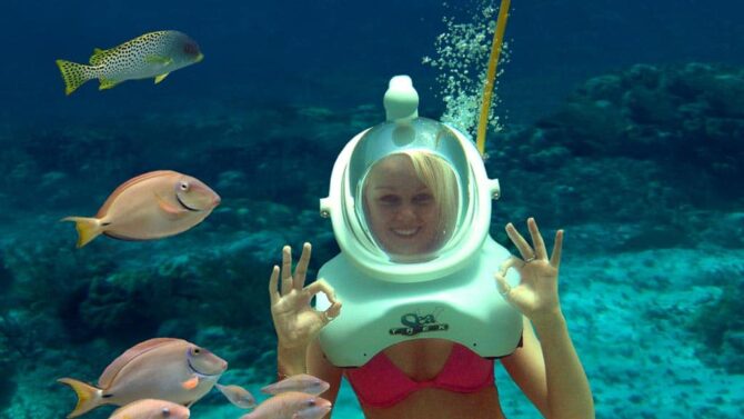 Seaquarium Punta Cana is an underwater park where you can take a walk. Participants are given special equipment, in particular, a diving helmet. Air enters through a tube. A tour of the underwater world is conducted with a guide-photographer. The photo shoot begins shortly before the dive. As a warm-up, it is proposed to swim in the company of a sea lion. The owner of the pond demonstrates his hospitality by patting the men on the shoulder and kissing the girls on the cheek.
