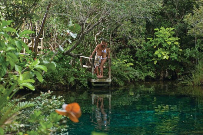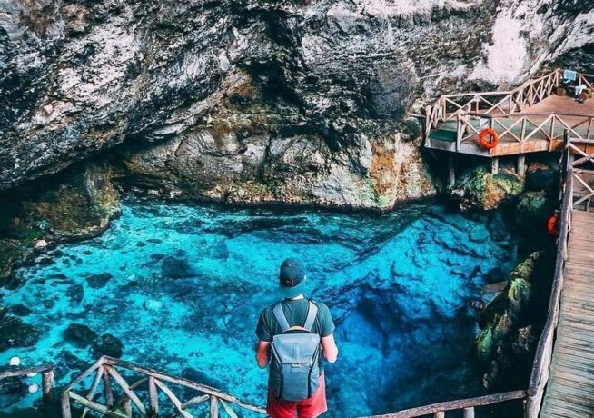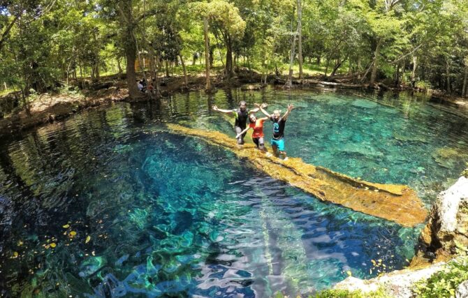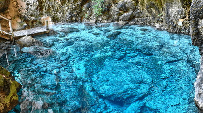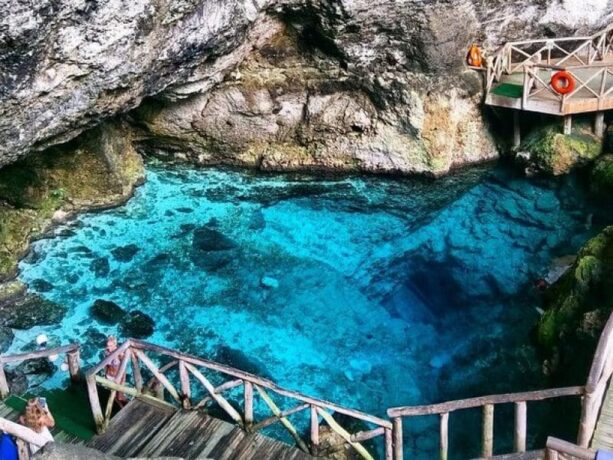 The Blue Lagoon Hoyo azul is located in the Scape Park. This is a stone pool of natural origin, filled with the purest turquoise water. Its depth reaches 40 m, but there are shallow areas for those who do not swim well. In addition, life jackets are issued to everyone who wants to swim. The most desperate and brave dive directly from the cliff or from the side of the bridge. You can also go down the steps into the water.