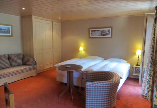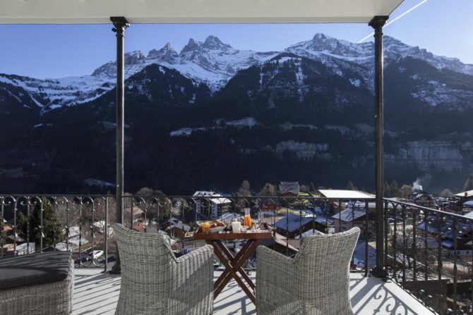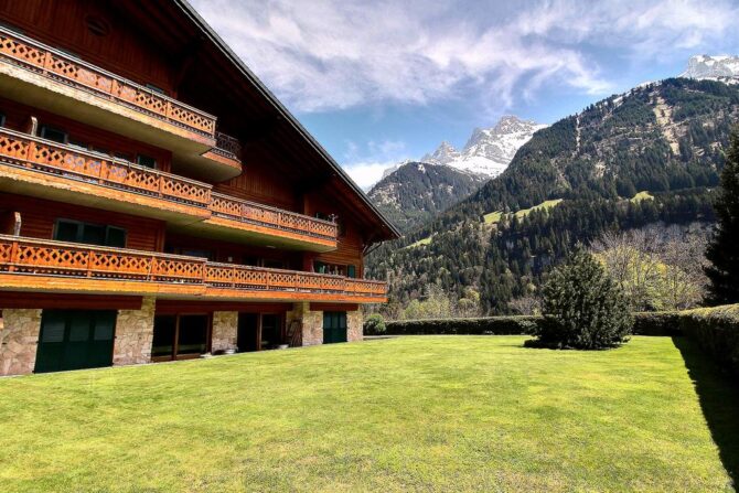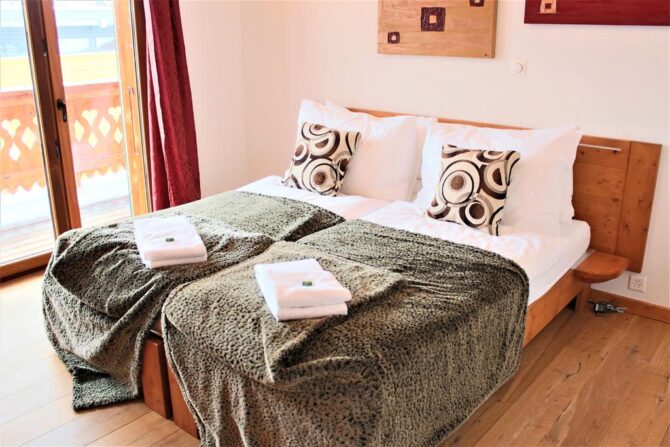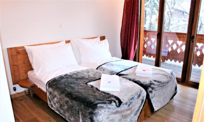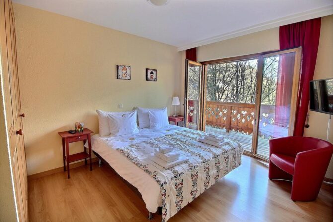 The complex has family rooms, double rooms and a spacious deluxe with a balcony overlooking the Dan du Midi mountain range.