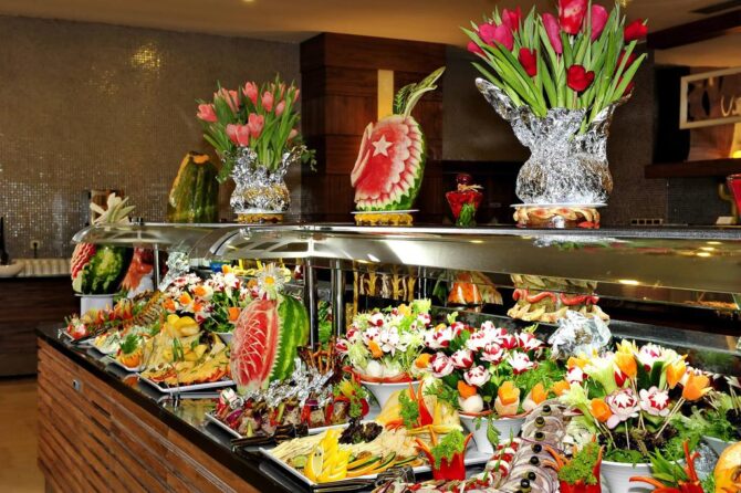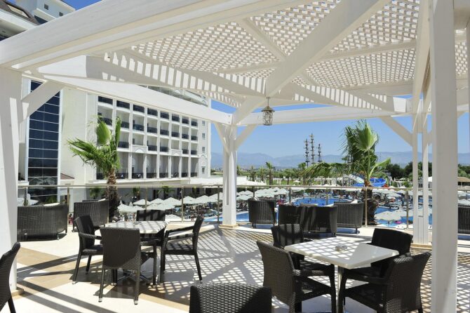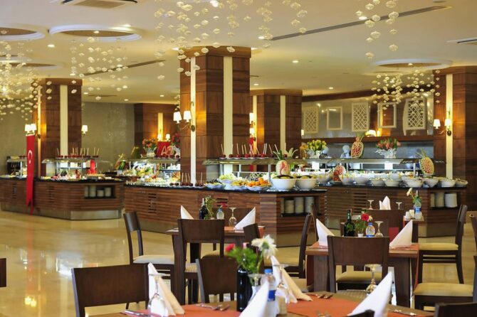 Hotel Lake & River Side Hotel Spa 5 * works on the system “all inclusive”. What does that mean? This concept includes the following points: breakfasts, lunches and dinners are provided free of charge, all service takes place in the main restaurant. Bars and cafes are open all day and close after midnight, so you can always enjoy light snacks and drink soft drinks. All locally produced alcoholic beverages are provided free of charge. There is a daily buffet with dishes from around the world, a large number of seafood caught in the Mediterranean Sea, as well as fruits growing in Turkey. In the menu of institutions there is a place for dishes without meat, consisting exclusively of healthy products, as well as food intended for young children.
