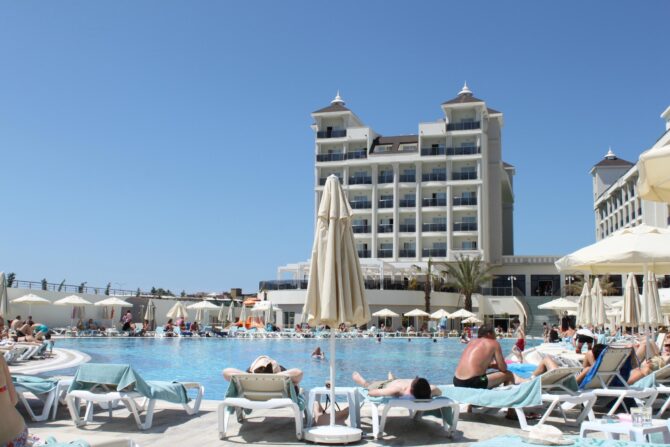 It is foolish to say that most tourists come to this country solely to get acquainted with the centuries-old history of Turkey. Of course, the lion’s share makes a trip in order to soak up the chic beaches. Own recreation area for guests is thousands of meters from the main building, it can be reached on foot, but for the convenience of visitors runs a comfortable bus. The private part of the coast is covered with small pebbles, so you should take care of special shoes. The entrance to the sea is safe even for kids, there is a towel center, a bar and a shop for buying beach accessories. Here you can engage in active sports: motorboats, bananas, catamarans, canoes, scuba diving, windsurfing, jet skis, water skiing and much more.