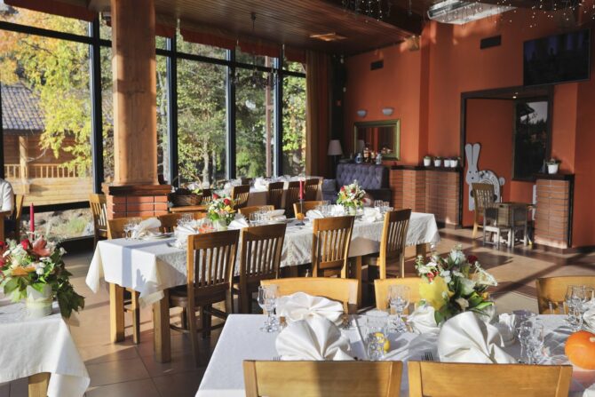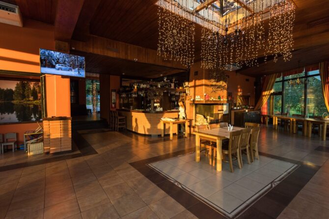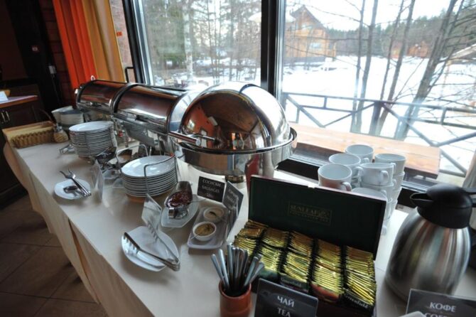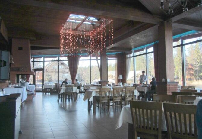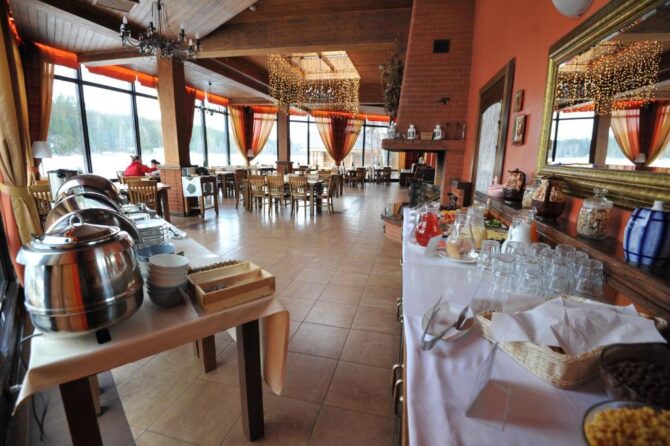 The restaurant room is spacious, with a high ceiling and panoramic windows overlooking the lake. In winter, the fireplace is drowned here, in the evenings beautiful sunsets, in the mornings the sun bakes and invigorates, if the weather is not hoar.