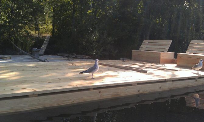 Swim in the lake from a comfortable wooden pontoon, in which ladders are arranged to enter and exit the water.