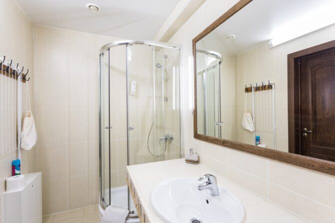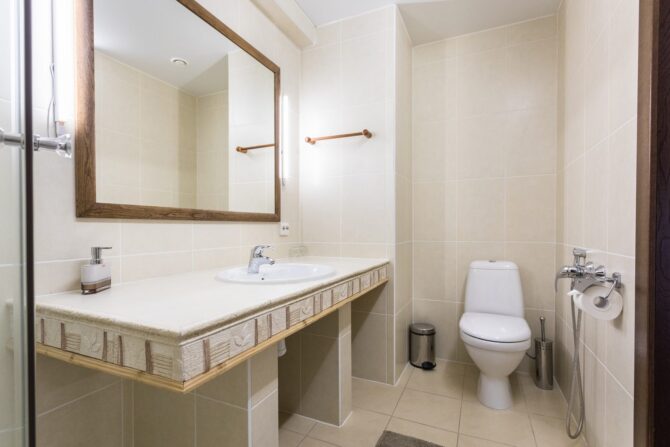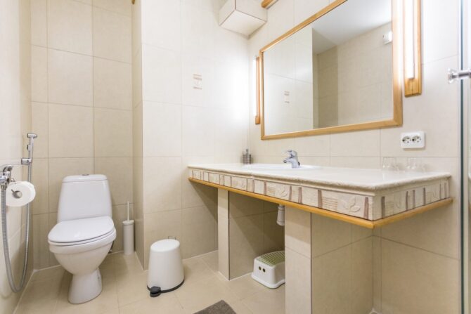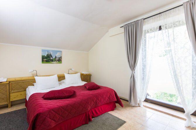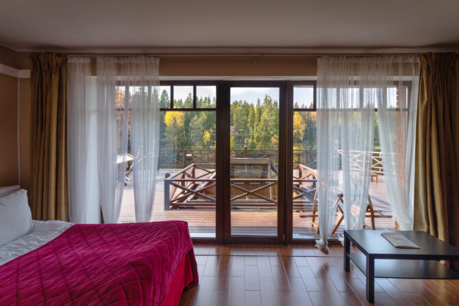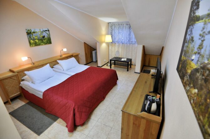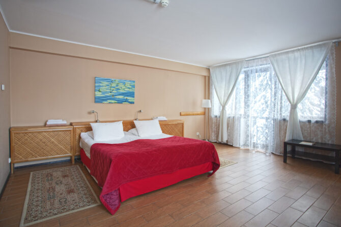 Standard room for two people has an area of 27 m2 and costs 4900r – from Sunday to Thursday, 5950r – Friday and Saturday. The room has a double or two single beds and plasma with smart TV. All necessary furniture, tea set and water, kettle, hair dryer and cosmetics. There is no kitchen or dining area. View of the forest and the lake. Beautifully decorated combined toilet with shower.