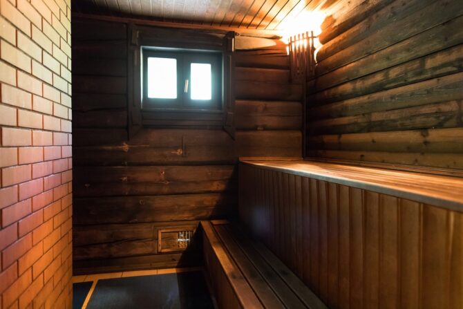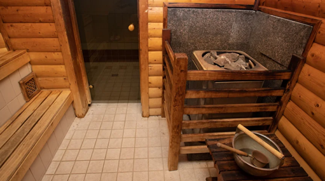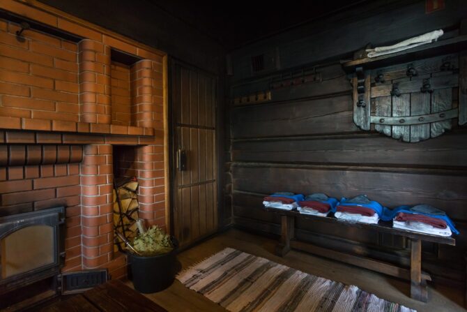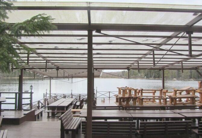 In “Tapiola” there is a convenient and inexpensive bath in which you can have a great time. In fact, there are two bath complexes – “in white” and “in black”. Each of them is a separate log house on the shore with bridges and stairs for swimming in the clear water of the lake. The log house has a steam room, a washroom and a large recreation room overlooking the lake, a massive stove and a large wooden table, which is usually used as a place for a feast. Serving dishes from the restaurant can be ordered by a certain time.