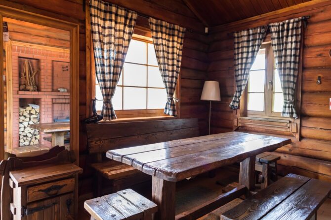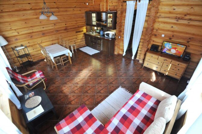 - “Russian House”– the most beautiful and expensive cottage with an area of 185 m2, accommodated up to 7 guests. To the equipment is added a Russian stove with a couch, a terrace with furniture and a small gazebo with barbecue. The space of the house is tastefully furnished, furniture and interior in a modern Russian style. Price from 15950r/20800r.