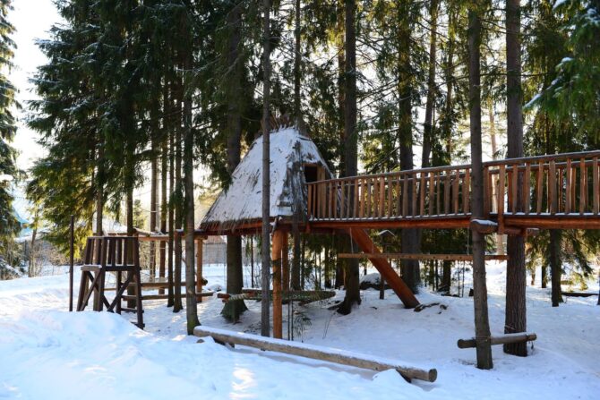 A whole wooden town was built here for children. There is a house among the trees with a slide, ladder and swings. Kids run and climb these buildings in dry weather. There is a trampoline, cars and runners. And in winter, my favorite pastime is riding on a cotton candy from the slide.