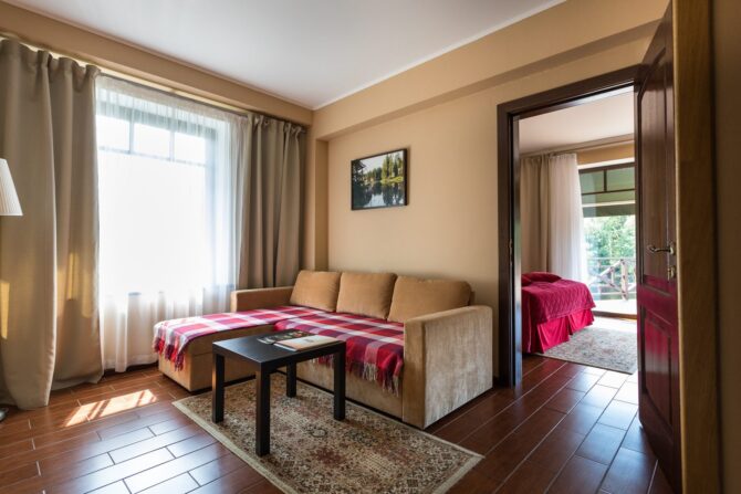 Standard Superior is a two-room suite with an area of 35-45 m2. A living room with a double sofa bed is added. Price from 6450r/7750r. Up to four people can stay. There are rooms with lake and forest views.
