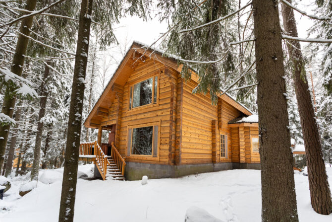 - “Hut”– a full house of 130 m2 cost from 13900r/17800r. Accommodates 4-6 guests. It is located in a coniferous forest 70 meters from the lake, which makes it a more private and secluded housing. A dishwasher with tablets and a fireplace are added to the equipment. The space is larger, the rooms are more spacious, the bedrooms have panoramic windows and views of the forest. Under the canopy there is a comfortable built-in barbecue and a large table with benches. Guests park at the house.