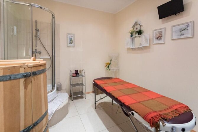 The spa room provides a considerable set of procedures here. A female specialist conducts them by appointment and owns massage techniques for both adults and children. General body massage costs 2500r per session of 1.5 hours. Children – 1500r for 1 hour. There are other types of massage: face, foot, back, “honey”. Also a variety of variations of peeling services, fitoboch, wraps.