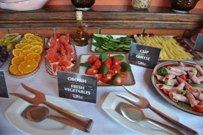 The buffet has a good selection of dishes for three stars. The first thing to note is fresh bread and pastries from a local bakery. There are pancakes with condensed alcohol, jam and sour cream. Tea, coffee, fruit drink, yogurt, juices. For lovers of healthy eating – rice with steamed vegetables and fresh vegetables. An omelette with fillers always looks tempting. Toast with herring, cheese, ham, sausages. And of course, a variety of cereals. A hearty breakfast complements the scenic view from the panoramic windows.