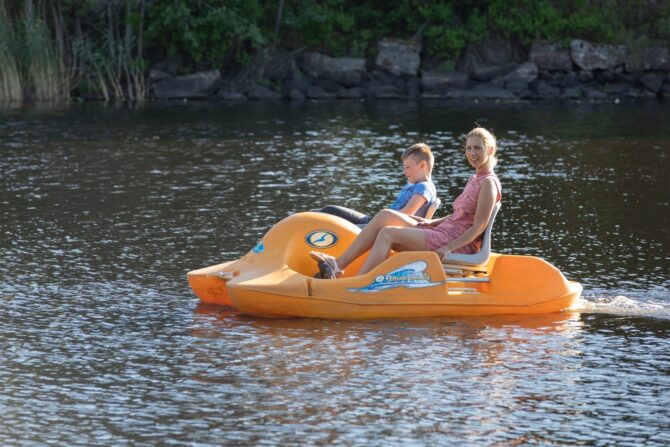 Boats with oars and catamarans cost 200r/hour for residents and 350r/hour for other guests. The length of the lake is 6 km, on the opposite shore there is a mountain that you can climb and admire the beautiful panorama of the Karelian Isthmus. There you can also organize a picnic with kebabs, provided that all the garbage is collected in a bag and taken back. It is also convenient to fish from the boat.
